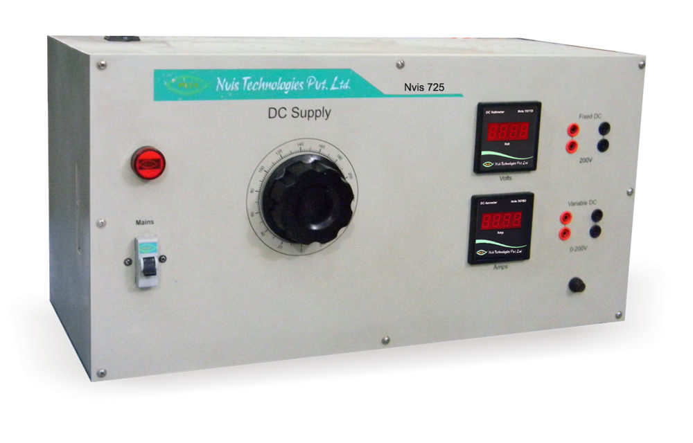 Nvis 725 DC Supply is an important device in Electrical laboratories. It is very helpful in performing experiments with DC Voltages. The product provides both Fixed and Variable DC supplies. Product is designed such that it can be easily connected to any other equipment. Additional meters are provided to observe the output voltage and current measurements.