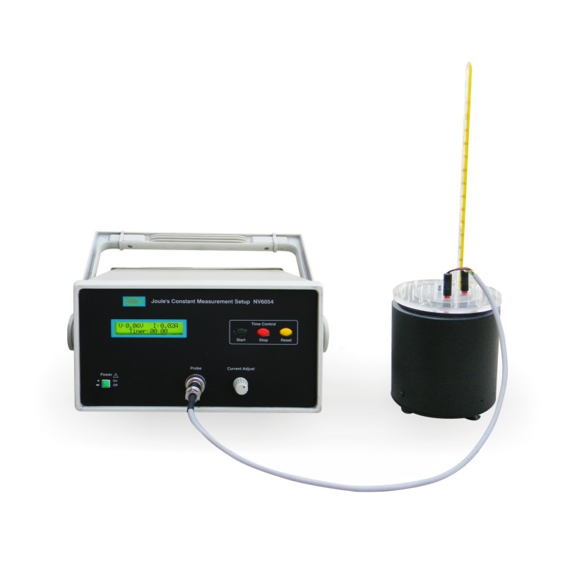 Nvis 6054 Joule’s Constant Measurement Setup (by electrical method) is useful to determine the mechanical equivalent of heat. It consists of Calorimeter to isolate water thermally from the surrounding and Measurement Unit with LCD to display Voltage, Current and Time. According to Law of Conservation of Energy, electrical energy provided is equal to heat produced if very less heat is lost through the system. Current is passed in a coil to rise the temperature of known mass of water in a calorimeter. By measuring heat produced corresponding to the provided electrical energy, value of Joule’s Constant is determined.