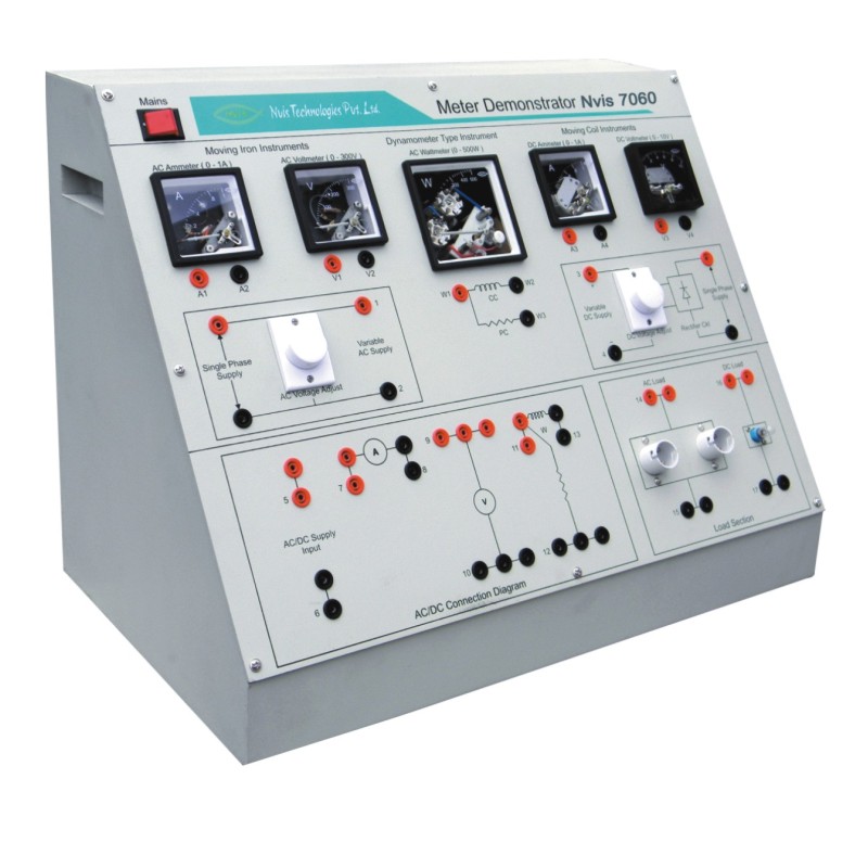 Nvis 7060 Meter Demonstrator is all in one, training product designed for the students to make them familiar with the variety of analog measuring instrument and their working principle. Variable AC and DC supply is provided to observe the response of each type of analog meter.