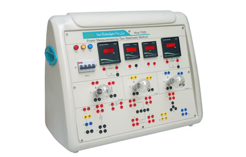 Nvis 7005 Power Measurement by Two Wattmeter Method is an exclusive and useful product for Electrical laboratories. It is designed to explain the students, how total power is measured in a three phase circuit using only two wattmeters. With this product, student can study the power flow in three phase system and correspondingly calculate Active, Reactive and Apparent power. Apart from this student can easily understand different three phase parameters like Line Voltage, Line Current, Phase Voltage, Phase Current and their mutual relationships to verify star and delta properties in three phase circuit.