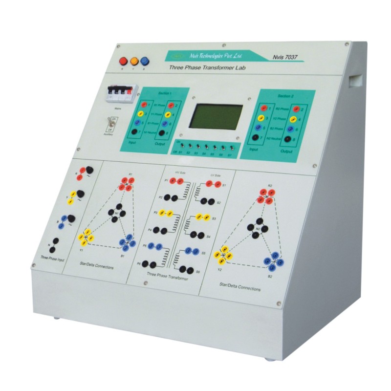 Nvis 7037 Three Phase Transformer Lab is an adaptable training system for the Electrical laboratories. The product helps understand basic concepts and functioning of a Three Phase Transformer. The product is represented in an easy way so that each test can be studied differently in proper sequence. Three Phase configurations such as Star-Star, Star-Delta, Delta-Star and Delta-Delta, Measurement of different losses and consequently determine efficiency and voltage regulation at any predetermined load etc.