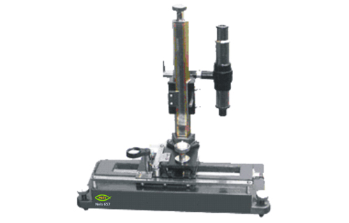 Nvis 657 Traveling Microscope is an extensively used product in Research, Colleges, Schools and Industrial laboratories for accurate measurement of the diameters of different objects. Two slow motion knobs are provided for taking accurate readings. For placing objects on horizontal stage, milky cenolite sheet is provided on the base. The position of the Microscope can be varied coarsely by sliding along the rails, or finely by turning the screw. The microscope is focused by rack and pinion, and has achromatic objective of 50mm focal length and eye piece with cross line graticule. Purpose of the microscope is to aim at reference marks with much higher accuracy compared to bare eyes .It is used in labs to measure refractive index of liquids using the geometrical concepts of Ray Optics. It is also used for accurate determination of small variation in the liquid levels, the refractive index of liquids as well as in surface tension & diameter of capillary tubes with precision.